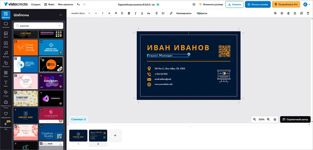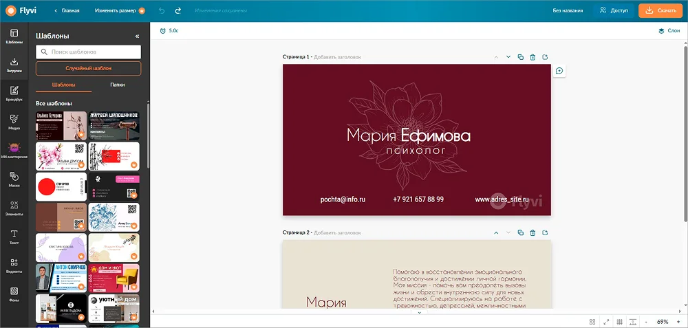 Этот редактор отличается простым интерфейсом. Его легко освоят пользователи любого уровня. Помимо готовых шаблонов, он располагает хорошей библиотекой фонов, иконок и шрифтов, с помощью которых можно быстро персонализировать дизайн.