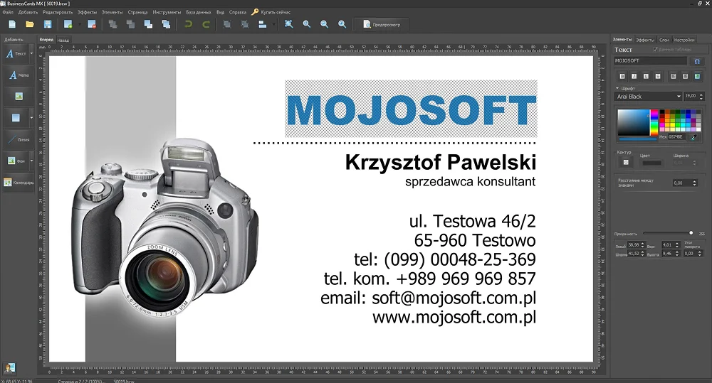 Специализированная программа для визиток, удостоверений личности и календарей. Дает возможность конструировать дизайны по предустановленным шаблонам и с нуля. Располагает встроенной библиотекой графики. Доступен импорт медиафайлов с ПК.