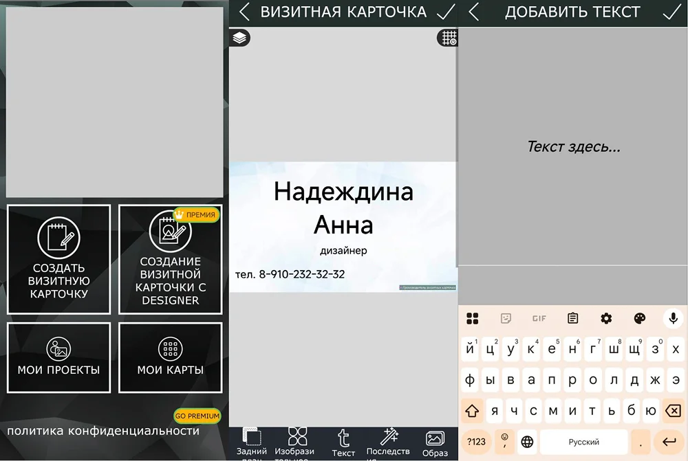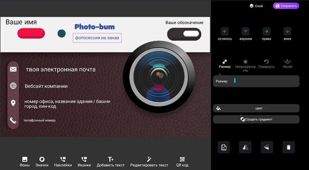 Приложение не подойдет для профессиональных дизайнеров, но поможет экстренно сделать простой вариант бизнес-карты или бейджика. Результат можно сохранять в виде проекта, чтобы продолжить редактирование или скачать как изображение в галерею.