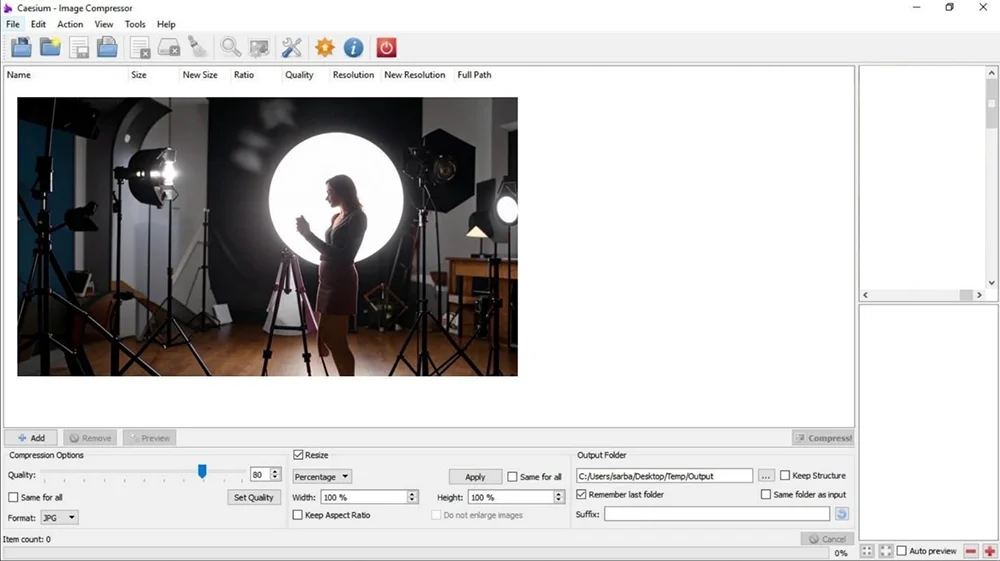 Приложение отличается интуитивностью: переносите материал — и через секунду получаете облегченные снимки. Есть профессиональная версия с функцией мониторинга папок, когда новые элементы автоматически обрабатываются по заданным настройкам. Также доступна интеграция с Adobe Lightroom.
