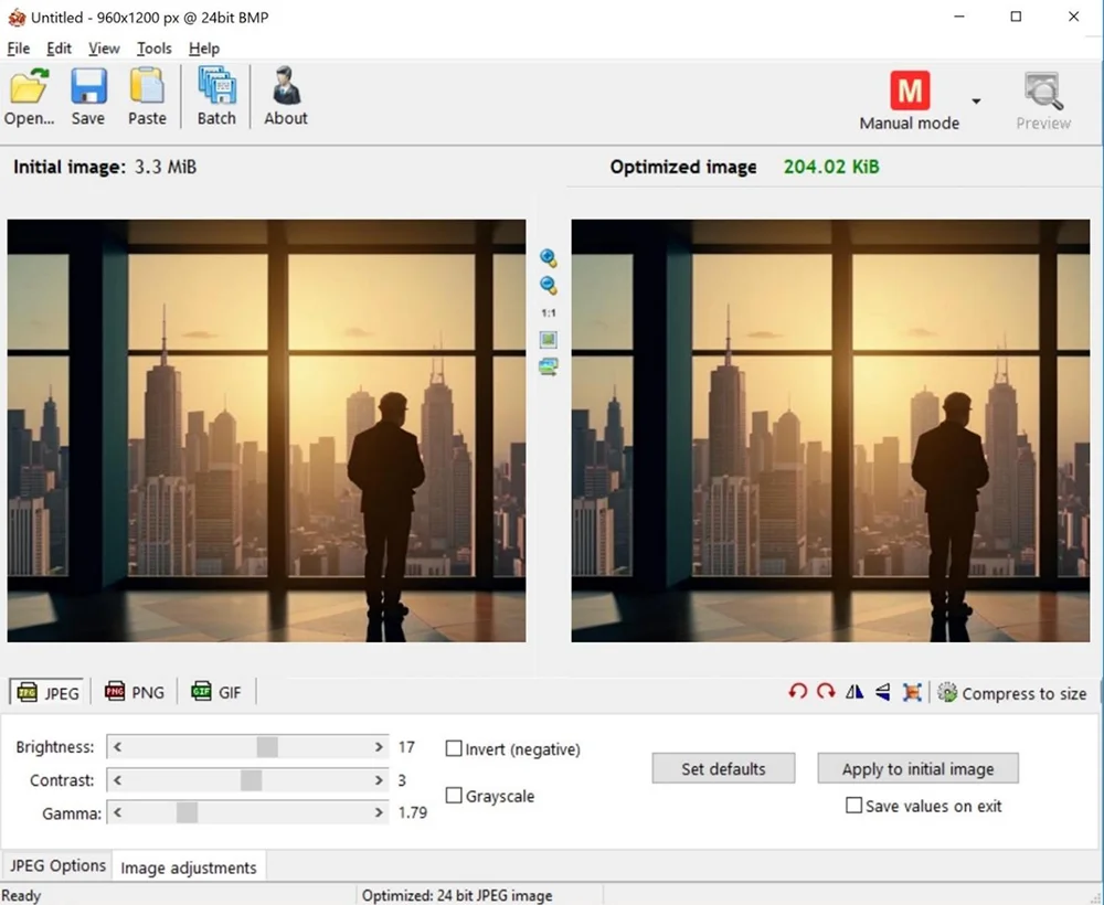 Можно задать точное ограничение в килобайтах, выбрать качество сжатия и адаптировать картинку под нужный объем. Фильтров и опции кадрирования нет — RIOT заточен строго под оптимизацию.