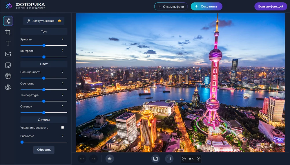 Сервис дополнительно предлагает обширный функционал: интеллектуальную ретушь, обрезку, поворот, вставку стикеров и текста, конвертер, коррекцию цвета и экспозиции. Удаление фона, автоматический кадр, регулировка резкости и насыщенности доступны прямо в браузере, без вотермарков. Меню на русском языке, адаптировано под мобильные устройства.