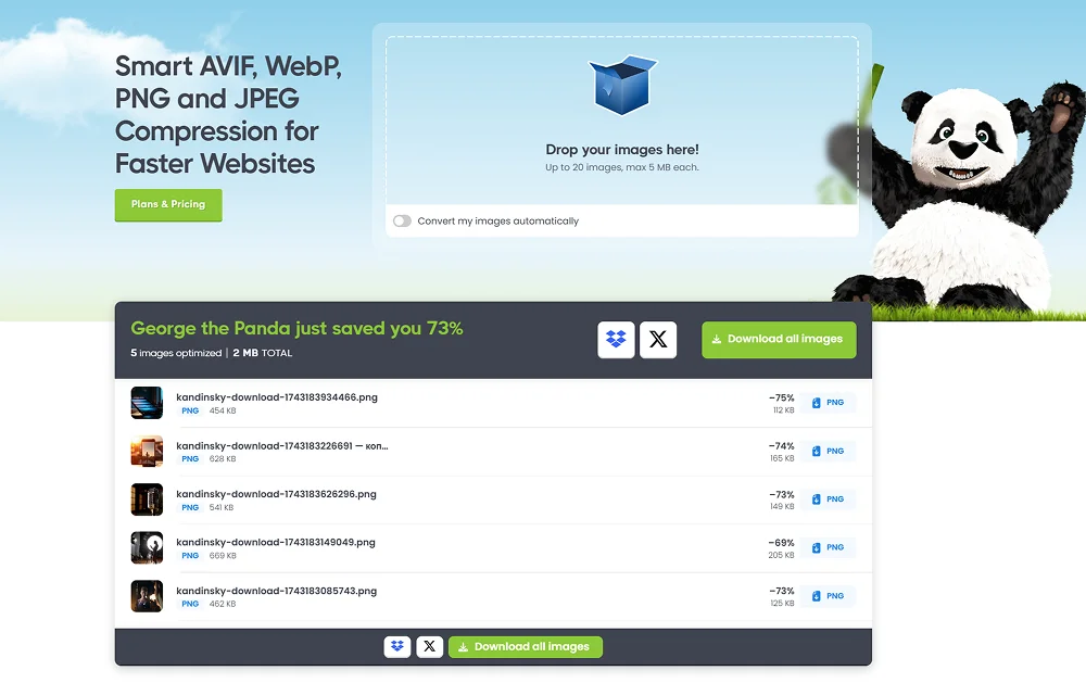 TinyPNG — один из самых популярных онлайн-инструментов для изменения PNG и JPEG-файлов без потерь. Использует алгоритм, который сохраняет резкость и при этом значительно уменьшает. Интерфейс простой: загружаете до 20 картинок и через несколько секунд получаете оптимизированные копии.