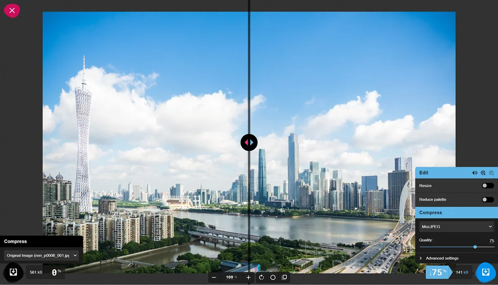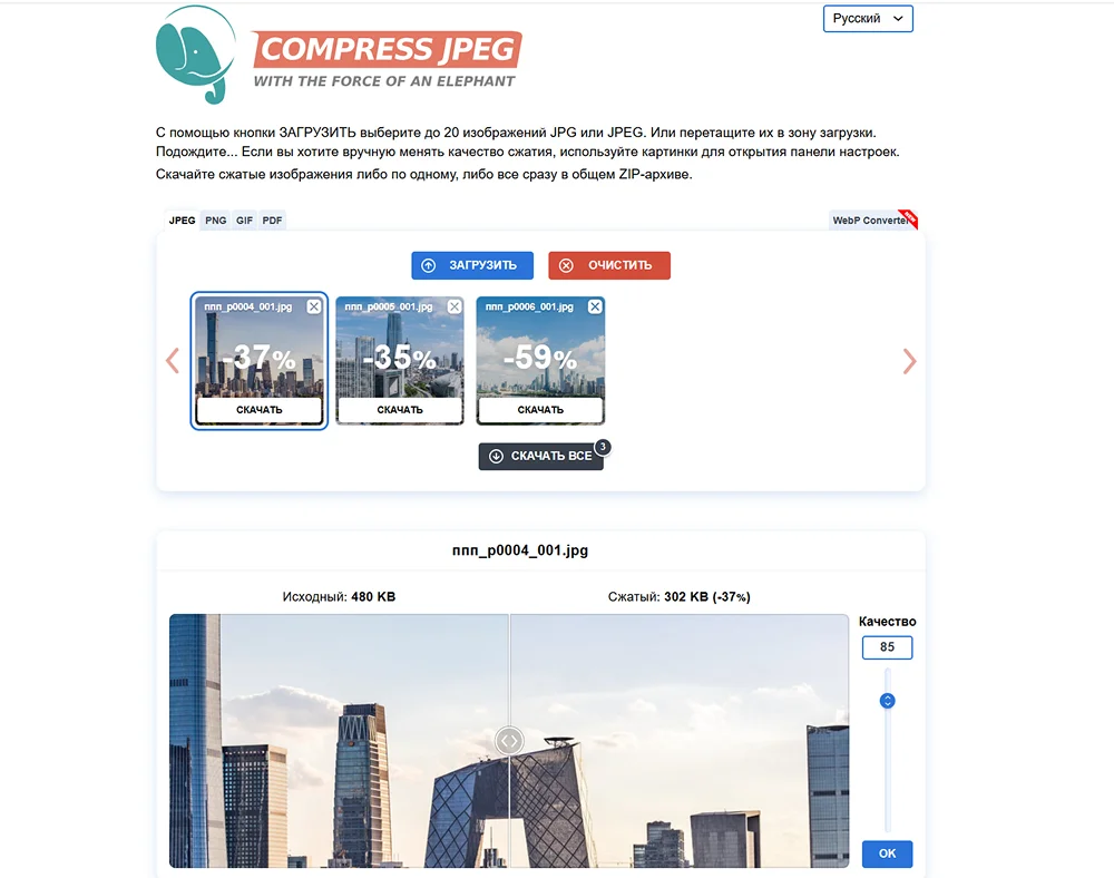 - CompressJPEG — онлайн-платформа с настройкой размера и других параметров JPEG.