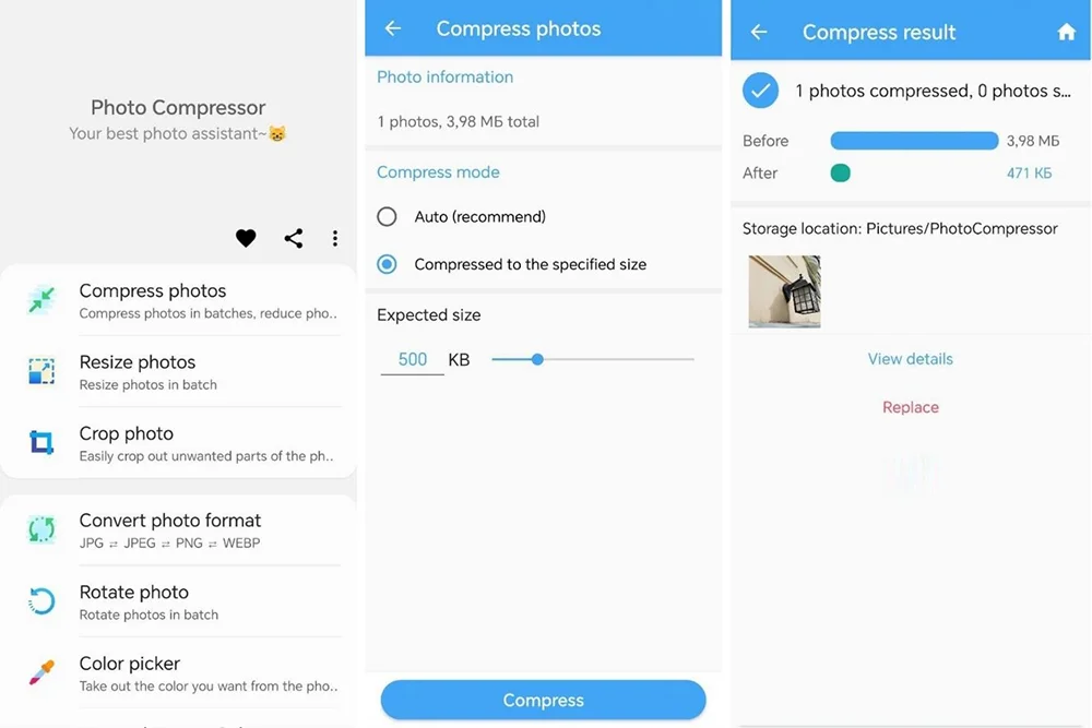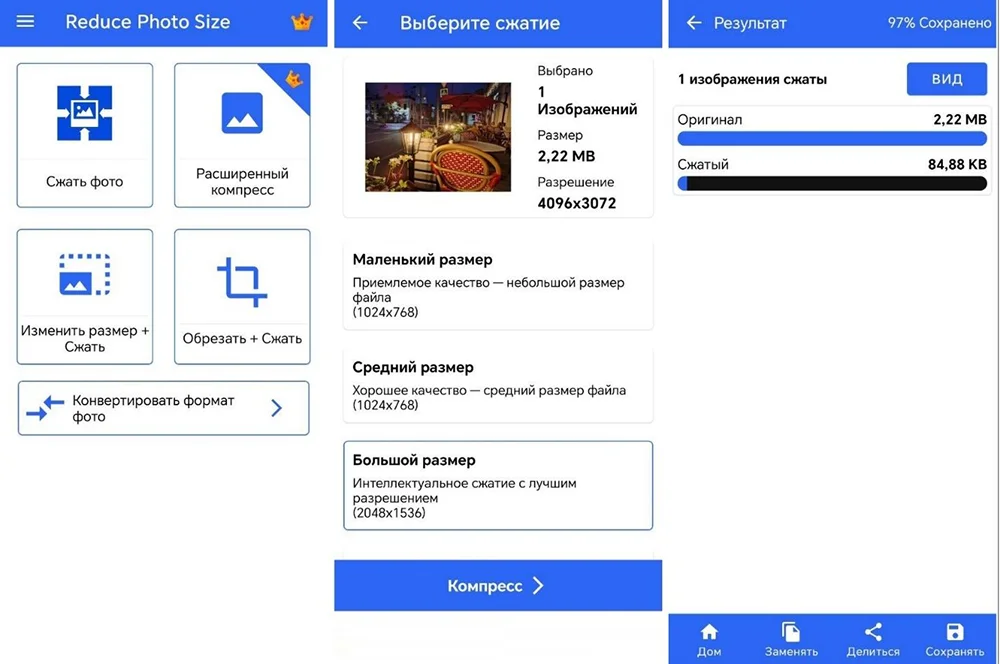 ПО разработано специально для оптимизации изображений на устройствах Android. Предлагает два режима: компрессию без изменения разрешения и масштабирование с новыми параметрами. Объекты можно обработать по одному или загрузить сразу несколько — результат отображается в виде процентов и абсолютного уменьшения в мегабайтах.