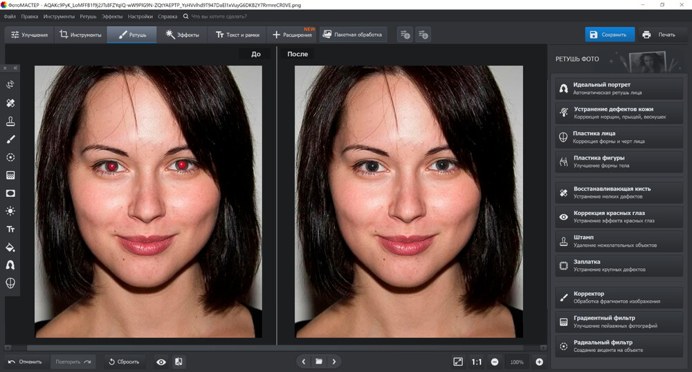 Софт позволяет быстро убрать эффект красных глаз с фото. После выбора нужной опции программа автоматически увеличивает картинку и приближает ту область, которую нужно редактировать. Сопутствующие полезные возможности для улучшения портретных фото — встроенные пресеты с готовым макияжем, удаление мелких дефектов на коже при помощи «Восстанавливающей кисти».