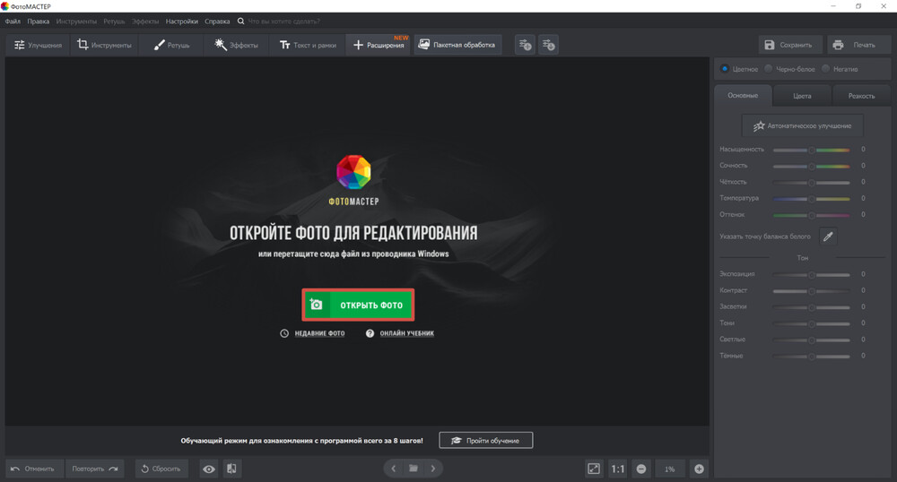 - Установите и запустите ФотоМАСТЕР. Кликните на «Открыть фото», выберите исходник.