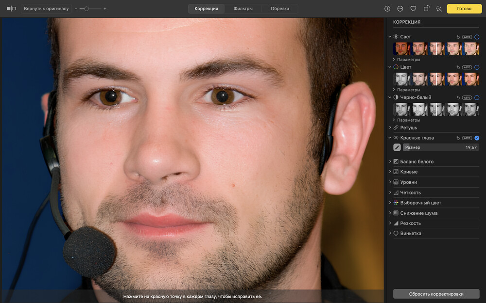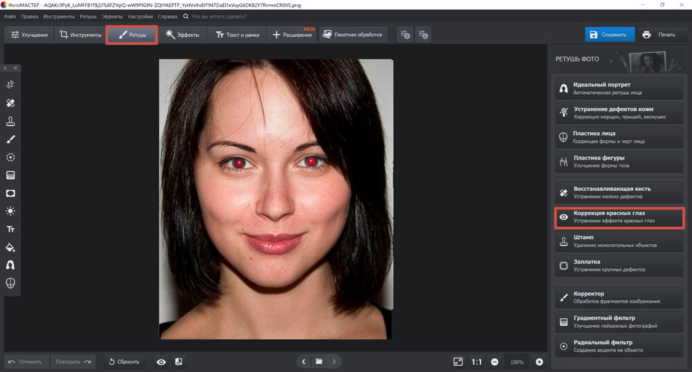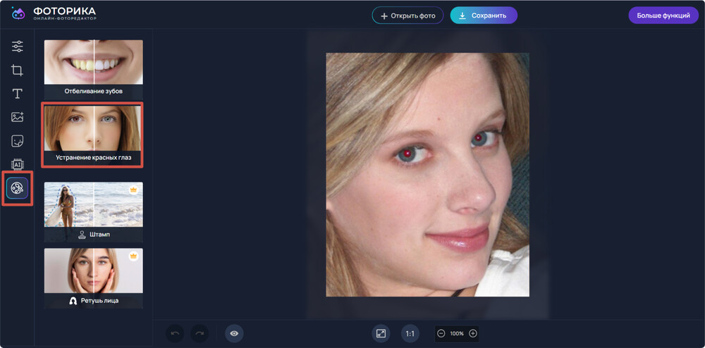 - В левой боковой панели выберите «Ретушь» → «Устранение красных глаз».