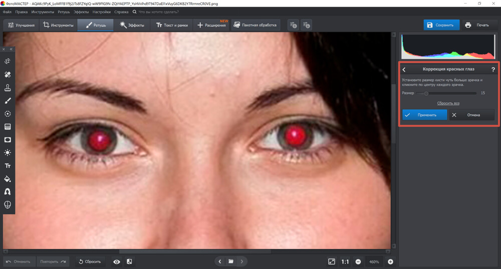 - Перейдите в «Ретушь» → «Коррекция красных глаз».