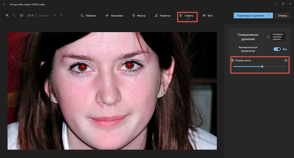 - Перейдите во вкладку «Стереть», отрегулируйте размер кисти, ориентируясь на диаметр зрачка. Проведите процедуру с каждым из них по отдельности.