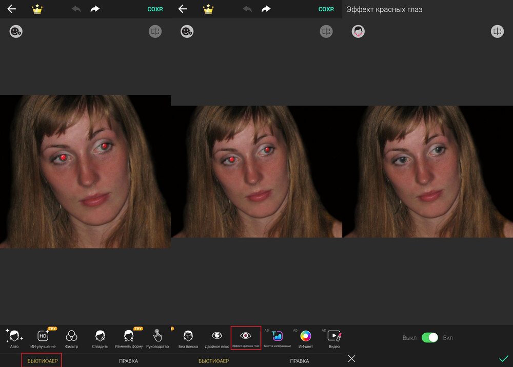 - Перейдите в раздел «Бьютифаер». На панели с опциями найдите «Эффект красных глаз».