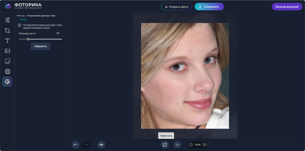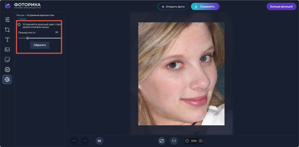 - Загрузите снимок, на панели слева нажмите на модуль «Красота» → «Удаление эффекта красных глаз», отрегулируйте размер кисти и исправьте недостаток.